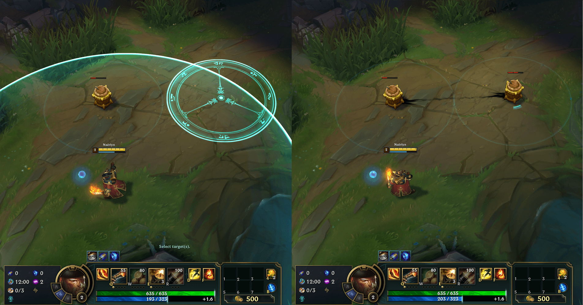 If an opponent sees Gangplank placing a connected barrel going forward, they will watch for the triple barrel chain. But if they only see a disconnected barrel under their feet, they'll likely try to challenge it instead.